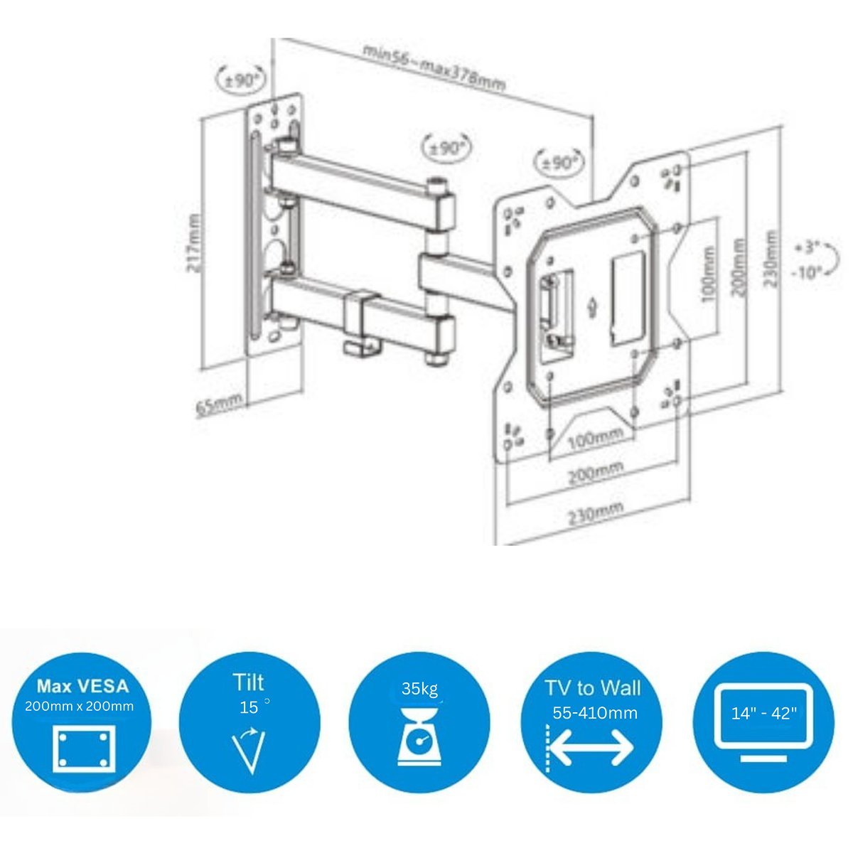 Heavy-duty full motion mount for 14"–42" TVs with 35kg capacity, offering superior tilt, swivel, and extended reach.