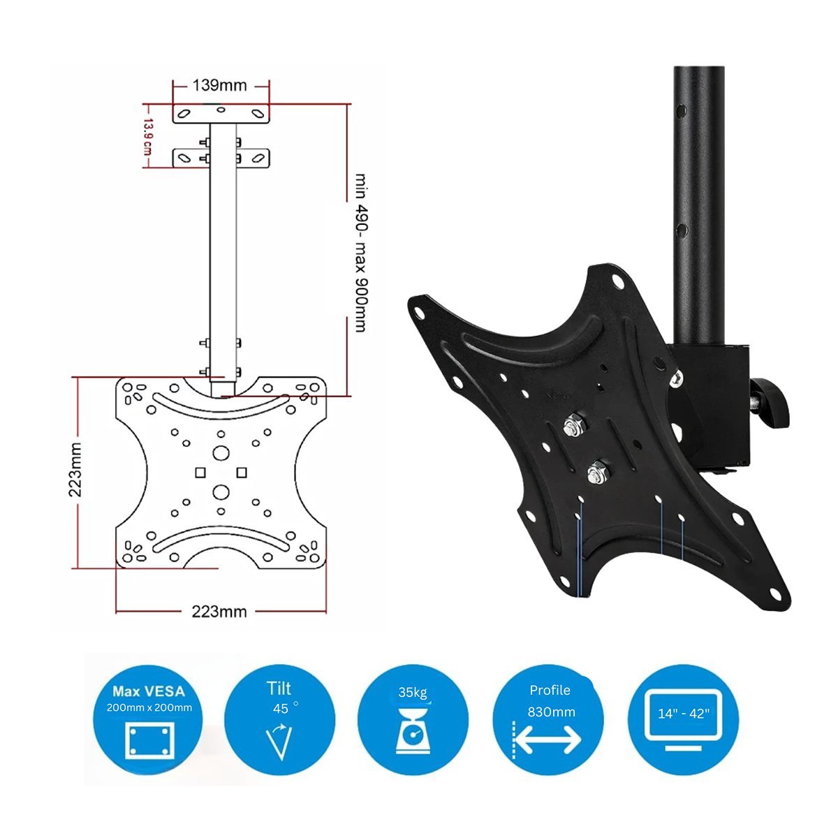 Ceiling-mounted TV bracket for 14"–42" screens, offering a sturdy 35kg load capacity and wide 45° tilt adjustment for clear viewing.