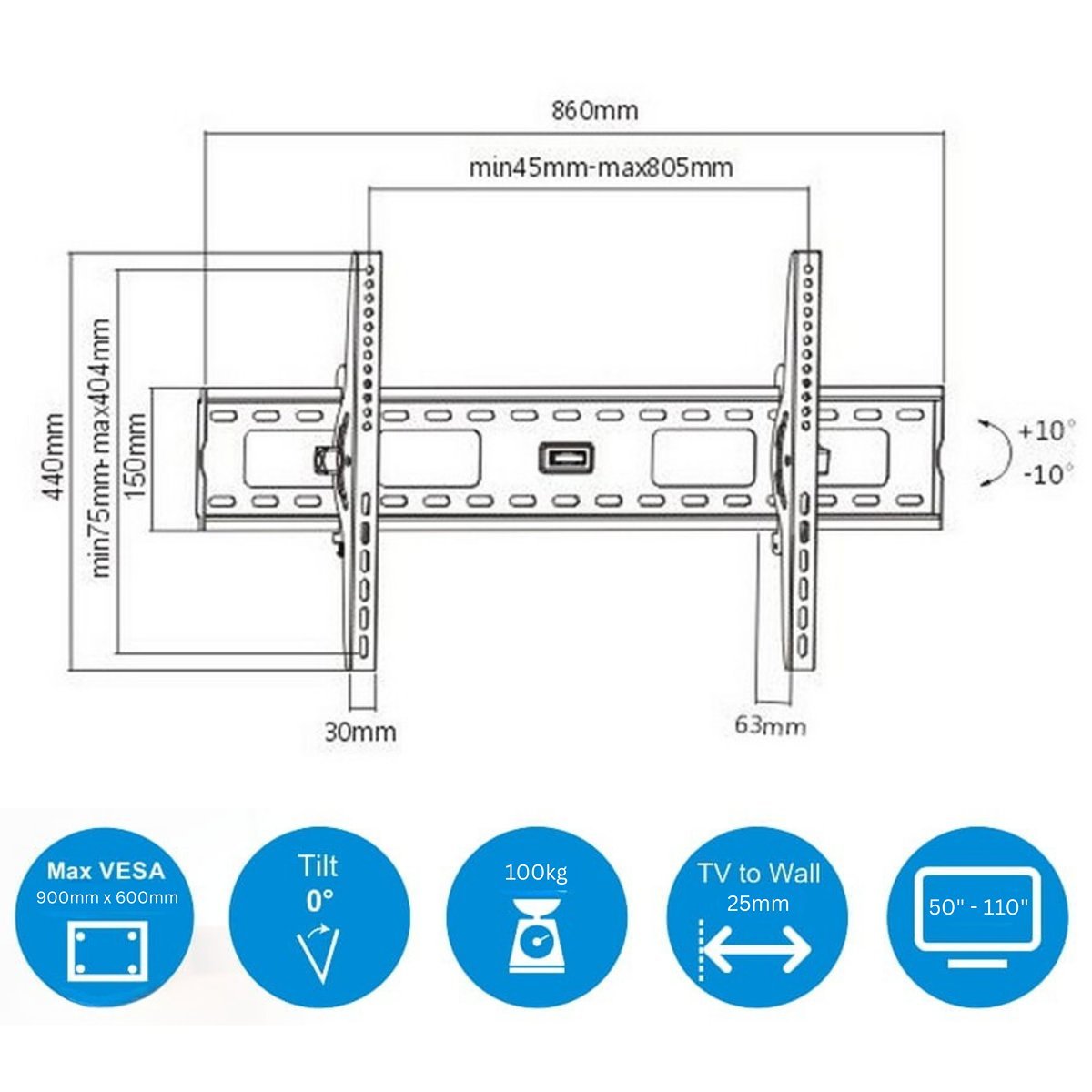 D900 Ultra-wide heavy-duty flat mount for 50–110 inch displays with 900×600mm coverage and 100kg capacity.