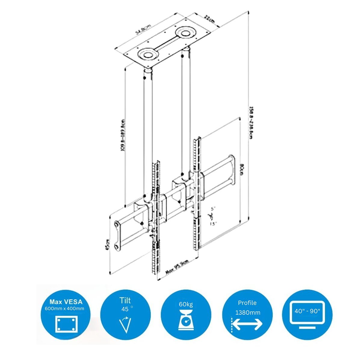 Heavy-duty ceiling TV mount for large 40"–90" screens with extended 1380mm drop and 45° tilt.