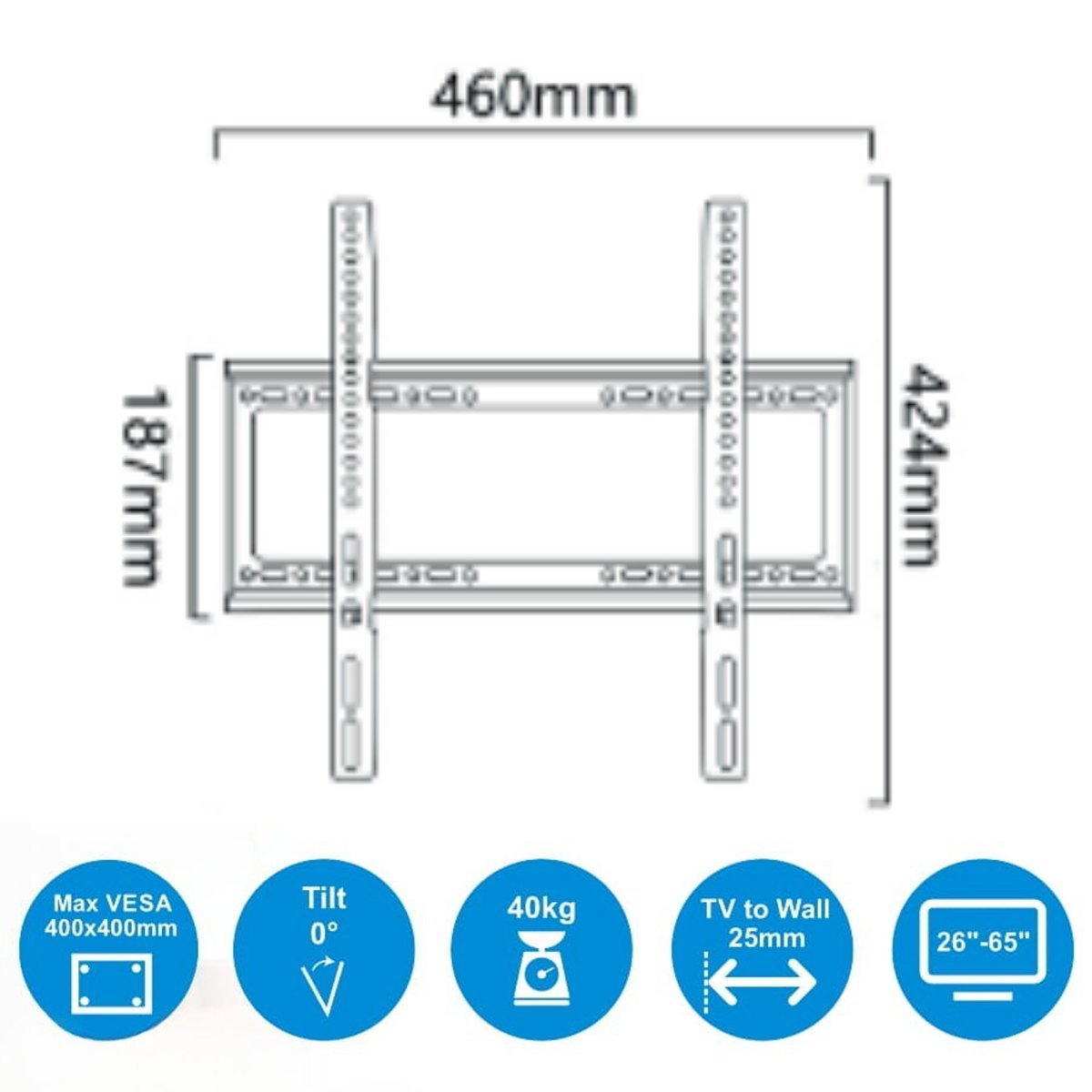 F2663 Heavy-duty fixed TV mount for 26–63 inch LED TVs with 20mm slim profile and 50kg load capacity.