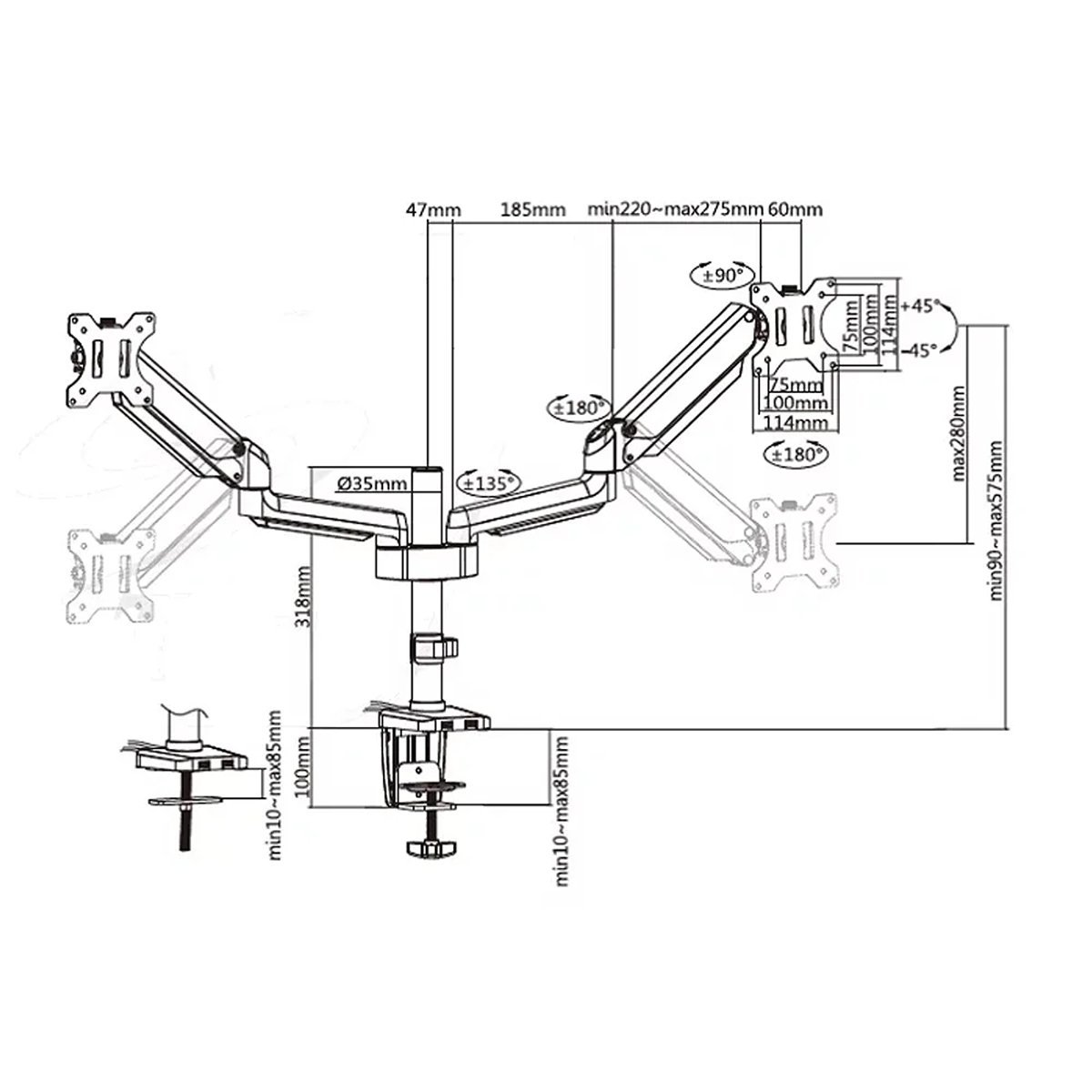 Dual gas spring monitor arm for two 14"–32" displays with wide motion flexibility.