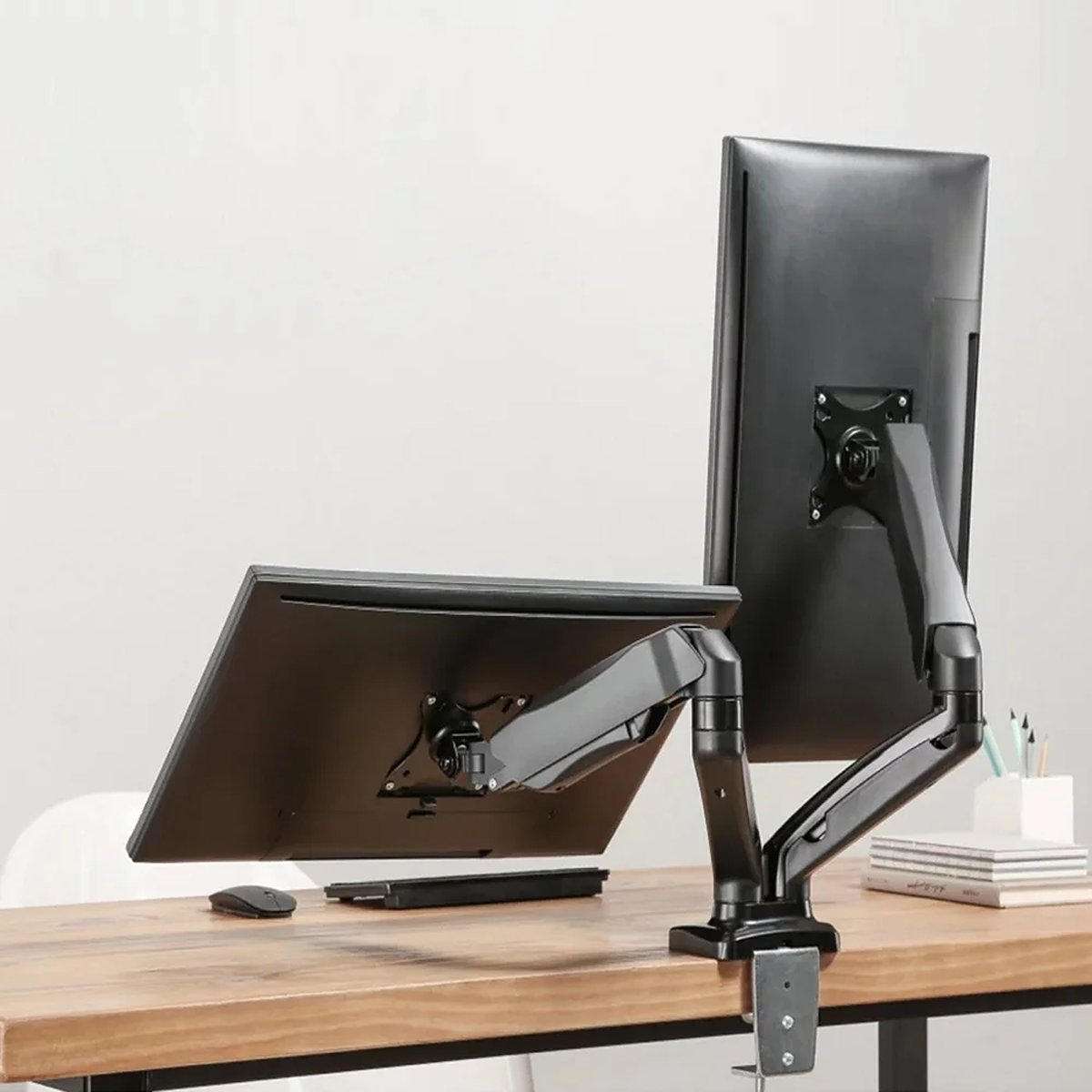 Dual monitor arm enabling side-by-side screen (14"-32") positioning for improved productivity.