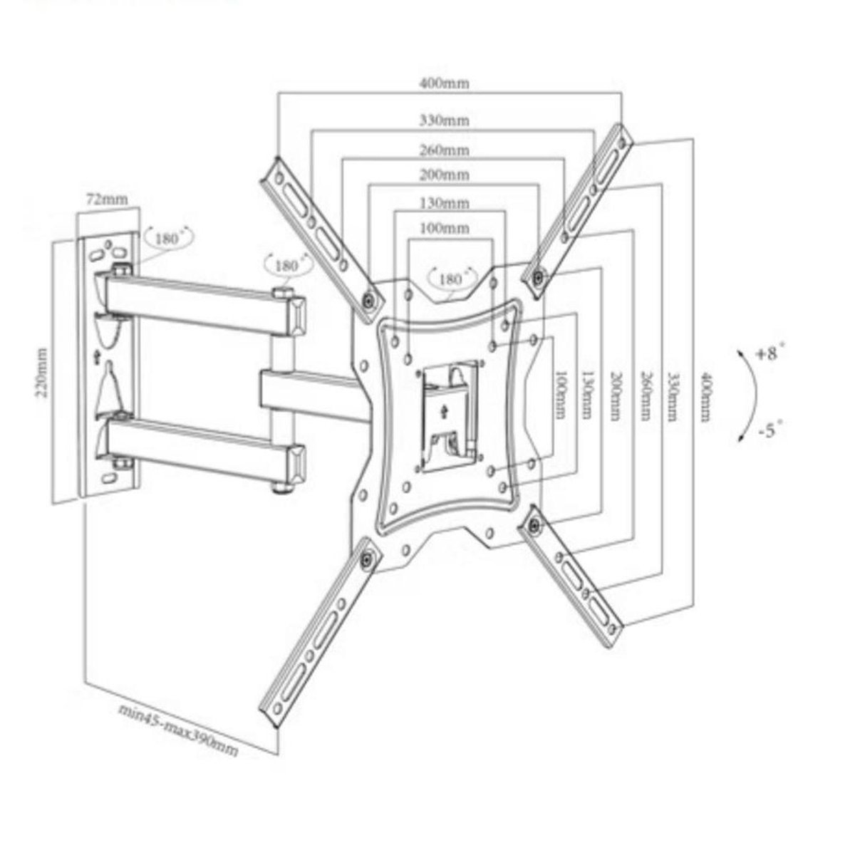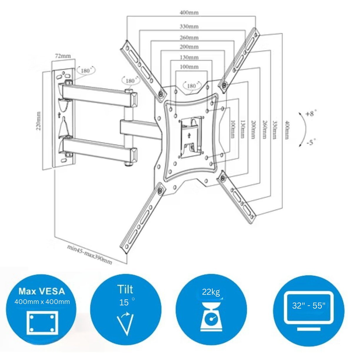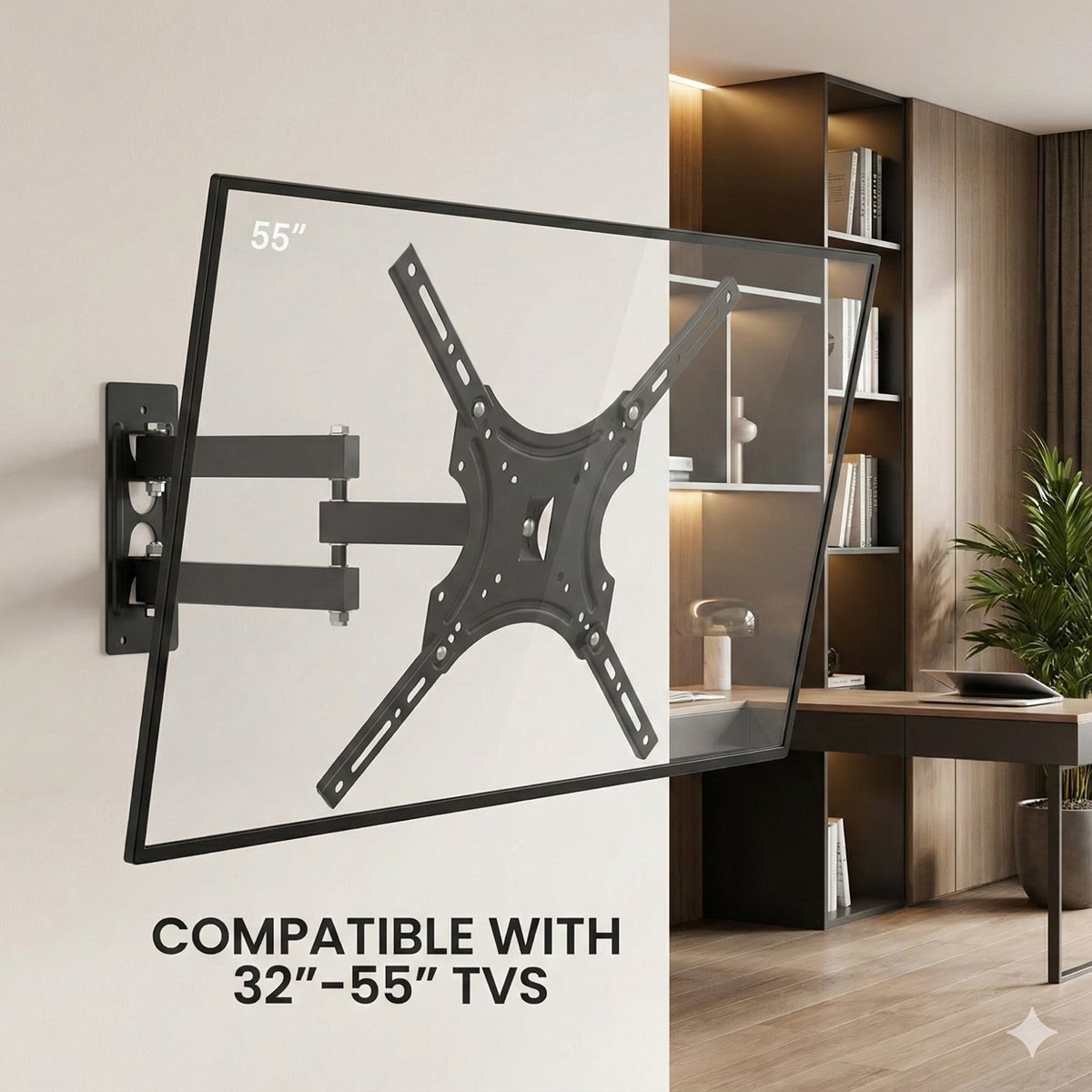 Compact full-motion mount for 32"–55" TVs with smooth tilt and swivel for flexible viewing.
